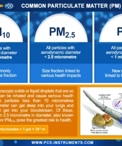 Máy đếm hạt PCE-PCO 1 là máy đếm hạt laser hoặc thiết bị đo bụi để đo nồng độ của các hạt trong không khí. Thiết bị đo bụi lý tưởng để giám sát phòng sạch, chất lượng không khí trong nhà, mức độ tiếp xúc với khí thải, thuốc lá hoặc khói thuốc lá và các chất gây ô nhiễm không khí có hại khác cũng như mức độ bụi trong không khí. Các hạt khói thuốc lá chủ yếu được phân bố trong khoảng kích thước từ 0,1 đến 1,0 micron.