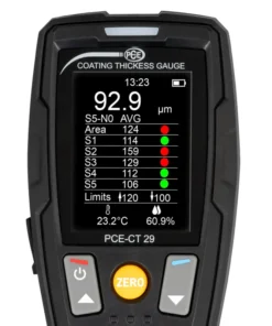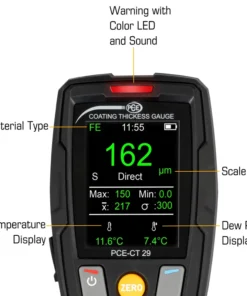 Máy đo độ dày PCE-CT29 có phạm vi đo từ 0 … 2000 µm. Máy đo độ dày có thể đo độ dày lớp phủ trên kim loại màu (Fe) và kim loại màu (NFe). Để phân tích kết quả đo tốt hơn, máy đo độ dày lớp phủ có chức năng đo dựa trên tiêu chuẩn SSPC. Với chức năng này, khả năng chống ăn mòn của lớp phủ có thể được kiểm tra bằng Máy đo độ dày.